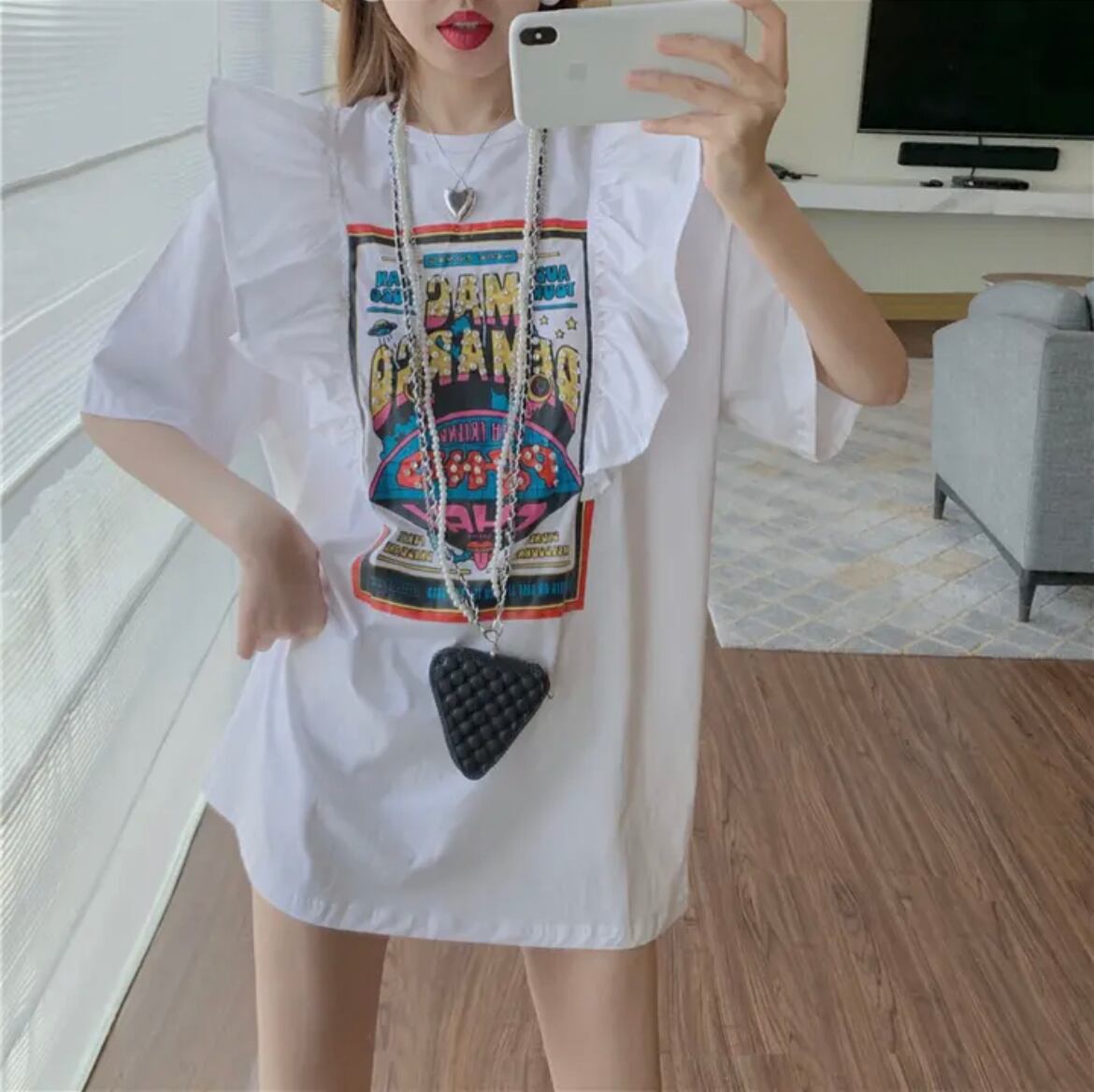 ルーズなシルエットに、かわいらしいフリルがアクセントのルーズフィットフリルT。一枚での着こなしはもちろん、レイヤードスタイルにもぴったりです。肩や腰はゆったりとしたデザインで、体型カバーにも最適です。