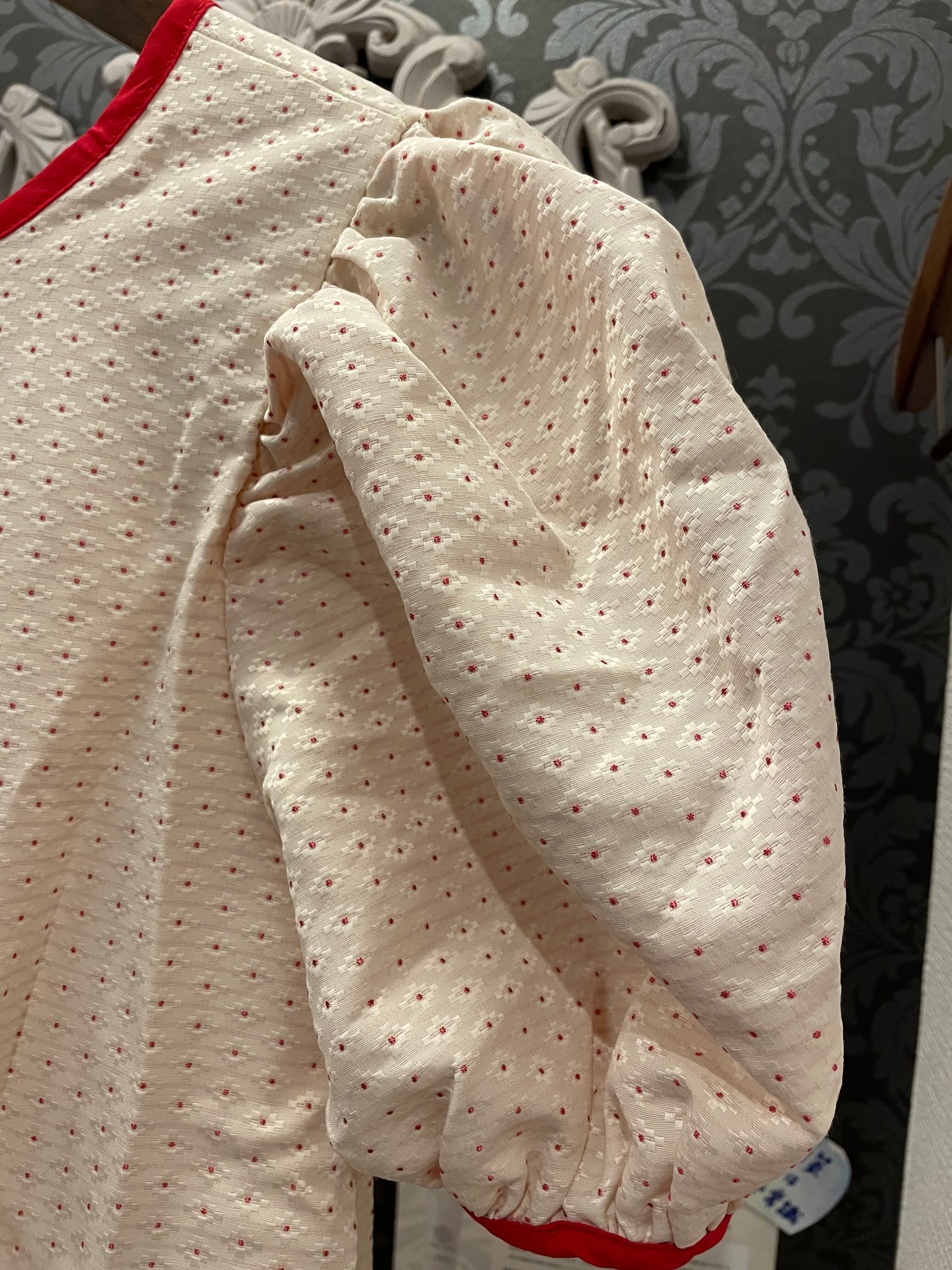 清楚な雰囲気のドット柄が可愛いパフスリーブワンピースです。赤のパイピングがポイントで、甘さを控えめにしてスタイリッシュな印象に仕上げています。ゆったりとしたシルエットと軽い生地感で、暑い季節でも涼しく快適に過ごせます。