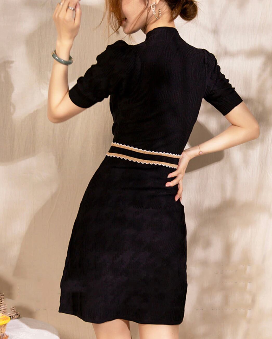 パールボタンやパイピングが品のあるニットのワンピース。ミニ丈でも首元など露出が少ないのでシーンを選ばず着こなせます。