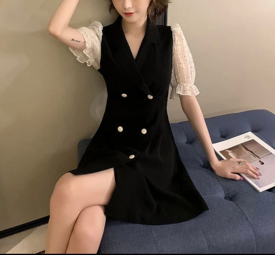 ダブルボタンと袖のシフォンが清楚なワンピース。