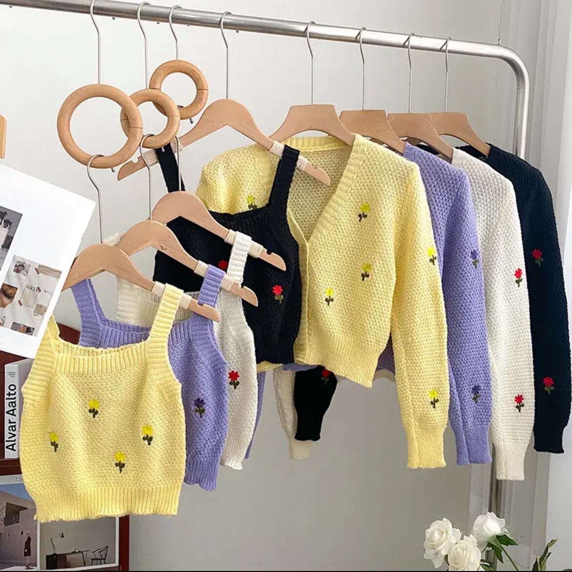小さな花の刺繍が可愛らしい4colors サマーニットアンサンブル。ショート丈のカーディガンとキャミソールの組み合わせで、夏のお出かけにピッタリのアイテムです。さらりとしたニット素材で、涼しげな着心地を提供します。 着用するだけで、女性らしさが引き立つ一着。花々のエンブロイダリーが繊細なアクセントとなり、周りと差のつくスタイリングを叶えます。4つのカラーバリエーションからお気に入りの一着をお選びください。
